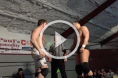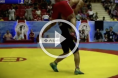 Watch this wrestler lift his opponent over his head and slam him on the mat.