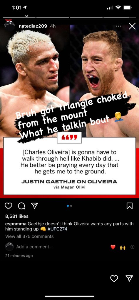 Nate Diaz clearly wasn’t impressed as he took to his Instagram Stories to remind Gaethje that he went to sleep against “The Eagle.”