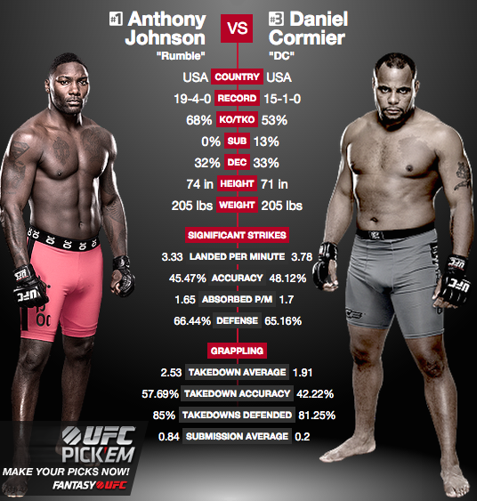 After several face lifts and card changes, the main-event for “UFC 187” is finally set and it is for the vacated UFC Light Heavyweight Championship. Olympic wrestler Daniel Cormier will be stepping into the octagon to face original challenger and heavy-hitter Anthony “Rumble” Johnson! Check out UFC.COM‘s full statistical breakdown of their matchup before they fight tomorrow evening: