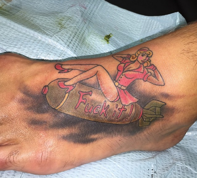Donald “Cowboy” Cerrone gives himself some fresh ink atop his foot.