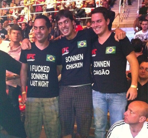 Ok, the guy in the middle, cool, ‘Sonnen chicken’ that’s clever. Guy on the right, ‘Sonnen Cagão’ (which Google Trasnlate told me means ‘Yellow-livered’), also, good use of your native tongue. Then, oh then, we have the guy on the left. ‘I F*cked Sonnen Last Night’………I’ve got nothing.