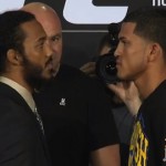 At today’s UFC 164 pre-fight press conference the champ and the challenger squared off in an intense staredown. Benson Henderson will look to defend his UFC lightweight title against Anthony Pettis this weekend at Milwaukee’s Bradley Center.