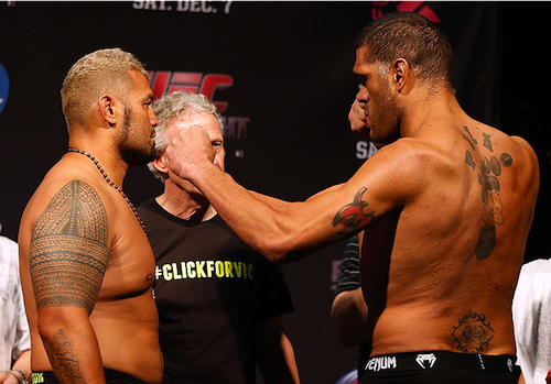 During the UFC Fight Night 33 weigh-ins event in Australia, the two heavyweight headliners engaged in an intense pre-fight staredown.