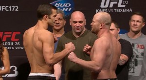 If you missed our live broadcast of today’s UFC 172 weigh-ins event, here are some of the most notable staredowns. (Click to enlarge)