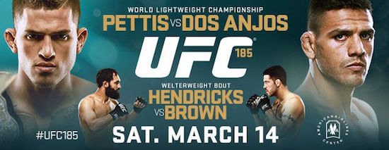 The UFC has released the official fight poster for “UFC 185: Pettis vs. Dos Anjos”. The event goes down March 14th from Dallas Texas, and will feature Anthony Pettis vs. Rafael Dos Anjos as Pettis looks to defend his title for the second time. In the co-main event, former welterweight champion Johny Hendricks will square off against fan favorite, Matt ‘The Immortal’ Brown.